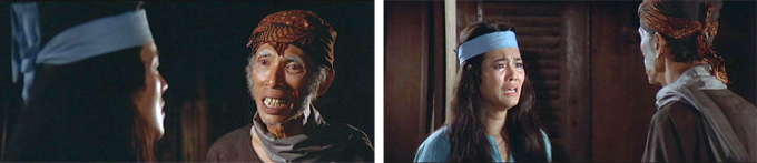 Surti returns home in tears, where she is met by her father (wizened old men with awful teeth are a hallmark of this movie). He is surprisingly unsympathetic, saying only “This is not good. They want to kill us all! Why do they want to kill us?” He seems unconcerned about Jaka, and also I have to wonder where he’s been that he doesn’t understand why the bad guys want to kill them.