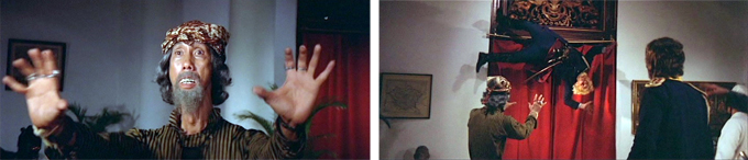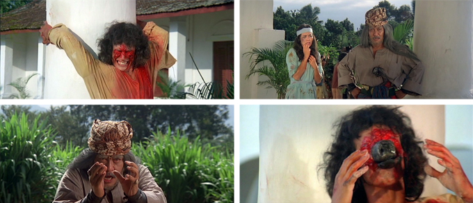 The plan is for the voodoo priest to bring life back to a dead magician named Ki-Etem (WD Mochtar), whose headless body has been buried. His head is currently hanging from a tree and the priest will reunite them. A skeptical Blond Lieutenant is given a demonstration of his skills (the priest’s modus operandi is evidently based on shaking his whole body convulsively and using his claw-hands to direct energy against his opponent) and Von Schram gives the go-ahead.