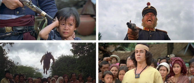 Prima plays Jaka Sembung, a man leading the rebellion against evil Dutch imperialists who are crushing the local people. He seems a rather ineffectual hero to me from the get-go, although he is called the Warrior and the villains hate and fear him appropriately enough. I notice, however, that he escapes from a chain gang early on by, well, running away as his comrades are slaughtered behind him. And his initial success at defeating a huge bald guy by the name of Kabor (S Parya) sent to kill him strikes me as lucky, with Kabor throwing himself onto a bamboo pole by mistake, thus driving it into his mouth and out through the back of his head. Until that, Jaka is pretty much getting his butt kicked and he fares even worse as we go on.