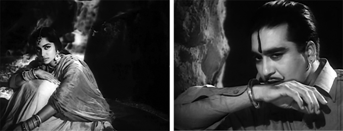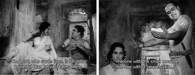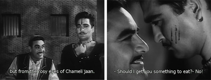She is much less enamored of him, especially when he kidnaps her after looting all the guests at the wedding. She refuses to dance or sing for him, so he shuts her into a room with strict instructions to his men not to give her food or water. I must say, the presence of Rajendranath adds welcome levity to these proceedings. He plays a kinder, gentler kind of dacoit named Dara Khan and sneaks food into Chamelijaan’s room while playing a prank on humorless (and creepy) Kripal, telling him that Chamelijaan has been talking about his good looks. It is really very funny, and Siddhu pulls off his part in it well too.