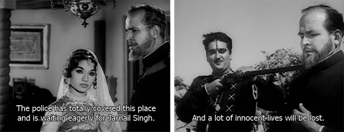 In any case, he goes into town to rob someone named Jagirdar. Jagirdar apparently has dared him to do so to as a way to impress the young girl (Kumari Naaz) whom he wants to make his fourth wife (some subtle messaging about the ewwww factor of a December-March marriage). Jarnail Singh knows that the police will be there waiting, but it’s a point of pride for him to go anyway. And it gives him an opportunity to face down the Superintendent with much manly hypothetical beating of chests and talk about izzat.