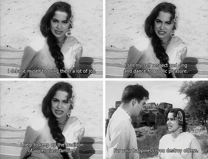 Chamelijaan continues to refuse to sing and dance for the dacoits, a situation which culminates in a confrontation with Jarnal Singh. He taunts her status as a tawaif, slaps her (boo!), and she responds with a furious but eloquent lecture.