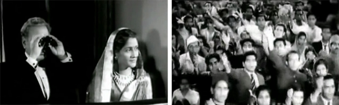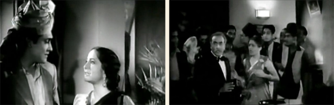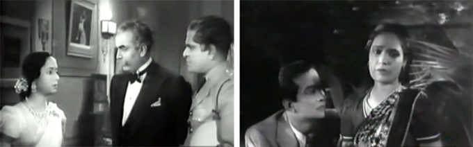 Inside the theater, they are seated in a box opposite a wealthy man named Indrajit (Mubarak) and his wife (?). Rani’s father ducks to avoid being seen by Indrajit and tells Shekhar that he used to own the theater and Indrajit worked for him, but that now he owes Indrajit money and Indrajit owns the theater. Shekhar’s own attention is caught by Indrajit’s wife’s lovely pearl necklace.