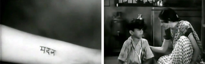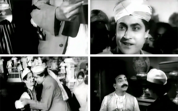 Rani and Leela’s house has been taken over by Indrajit as well, and he sends his weaselly manager (Haroon?) to hound them for rent every day. Indrajit and his wife live next door to Rani along with their son Mohan (Kanu Roy), and Banke works as their servant. Inspector Sahab comes to interview them about the stolen necklace and notices that there’s an extra unused place at the breakfast table. Indrajit is overcome and leaves the room, and his wife tells the Inspector the sorry tale of their long-missing son Madan (Mehmood in his first role). Madan (who has a tattoo of his name on his arm) was a scrappy little kid, always in trouble with his father. One day he was caught fighting with a neighbor boy and also gave his mother some back-talk (“You’re not my real mother!” which made me laugh out loud), and Indrajit kicked him out of the house without his lunch. Madan has never returned although they always lay a place for him at the table.
