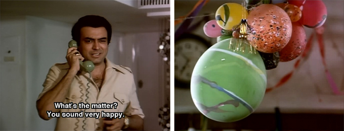 Vinod is also everything that Sunil is not (besides handsome): funny, happy-go-lucky, attentive, and he soon has Aarti laughing. Sunil calls to find out if Aarti has his pistol (she does) and why she hadn’t contacted him before she left. He’s a little miffed, and puzzled at her cheerful demeanor and promises to come down for Raju’s birthday party that evening, which is being held in their house since Vinod has finished his work there.