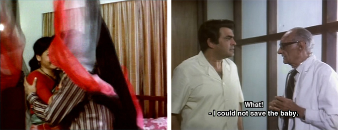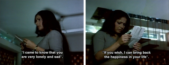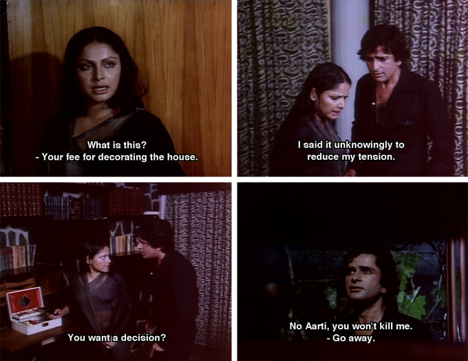 It begins reasonably enough, with poor lonely Aarti (Raakhee) pining for her once-attentive but now neglectful husband Sunil (Sanjeev Kumar). Sunil is a wildly successful surgeon, and completely obsessed with his work. He is also a jackass who thinks nothing of making fun of his wife to her face at a party, and when he does speak to her he’s condescending and dismissive.