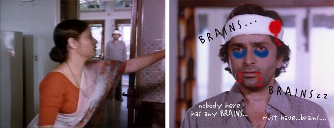 By now I am completely fed up with what an incompetent mess this movie is, and I begin to think of plot developments I would like to see, like Shashi as a Zombie Interior Decorator. We’ve already gone from love triangle to suspense thriller, why not toss horror into the mix? I’ll bet the Shash would have enjoyed that more too, especially since he plays the rest of this out as listlessly as anyone possibly could (he’s lost his memory, which apparently makes you robotic too).