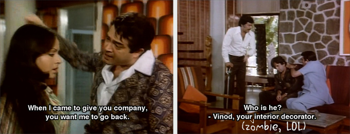 — At this point the movie takes a hard 180° turn from poorly done Mills & Boon territory into OTT psycho-stalking ridiculousness, and Aarti and Radha turn into the stupidest women on the planet. Aarti seems startled that Vinod would think she’s lonely and sad (massive *eyeroll*)