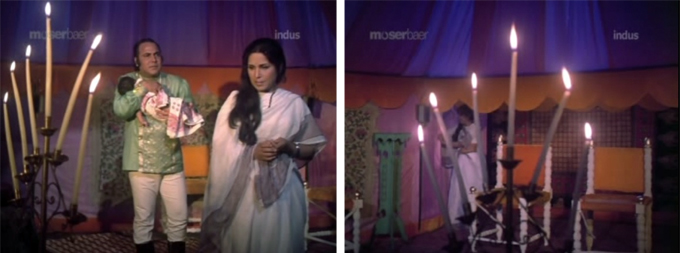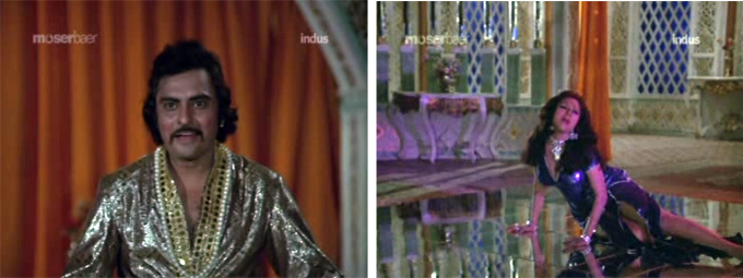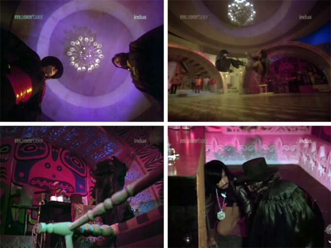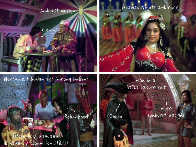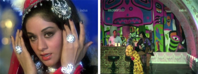 This joy is only reinforced by the next scene: Sheru shows up at the best dance-club-slash-restaurant I’ve seen since Apradh. Aruna Irani treats us to an Arabian Nights themed dance and looks gorgeous (and shiny). I am pleased to note that the decoration behind the bar is, well, Northwest Native American.