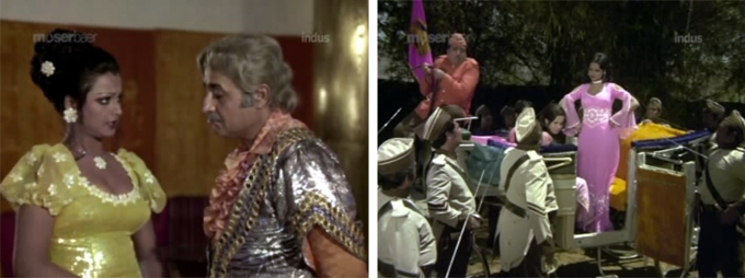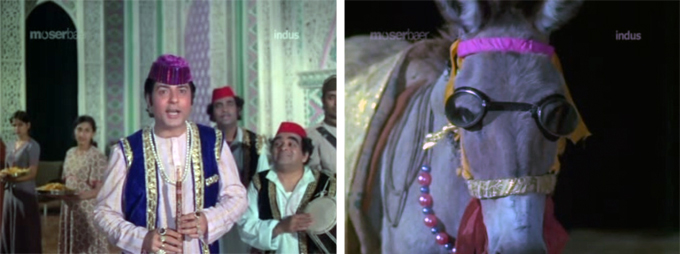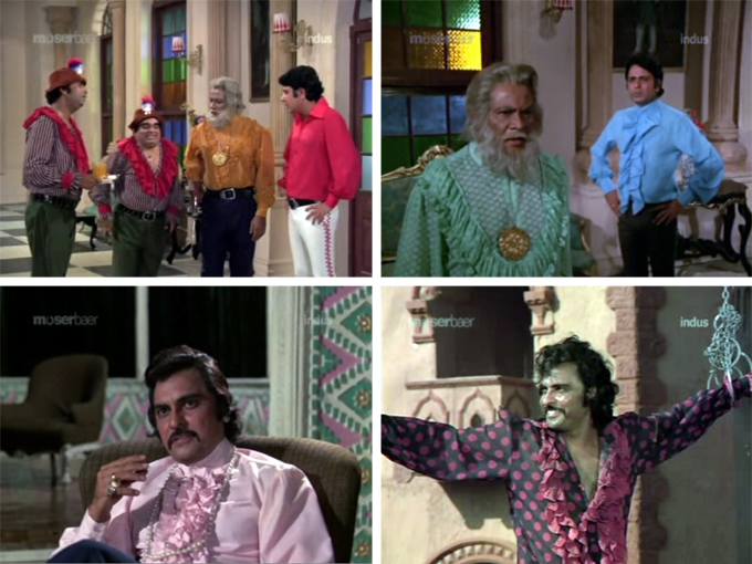 “Zorro” doesn’t even begin to cover it. “Zorro meets Robin Hood meets the Wild Wild West meets Arabian Nights meets Ugly Bridesmaid Dresses and everybody’s last name is Singh!” is a fair start. Dharam-Veer wasn’t this much of a potluck! My friend Mike, who watched some of it with me, remarked that it looks like the wardrobe and set people went crazy in a bunch of studio warehouses and used every single item they found in them. While they were doing that, I think the writers were combing through as much world literature as they could find for their own influences. I’m also pretty sure a lot of the original film is edited out or lost, because transitions between scenes are very abrupt and the whole thing quite choppy, so Lord only knows what other cultural and historical references have gone missing along with that footage.