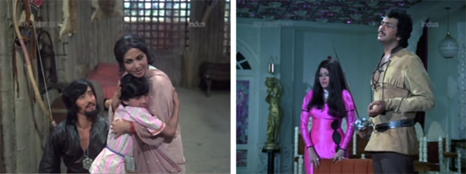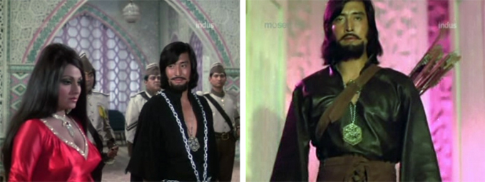 By now fed up with Zorro’s constant interference, Shamsher Singh decides to enlist the help of one Sheru Singh (Danny Denzongpa), currently housed in the palace dungeon. He gives Sheru his freedom in exchange for Zorro “zinda ya maut”. I can’t help but wonder what Baburao Patel would have had to say about Bindu’s appearance in this shiny satin monstrosity; and when Sheru changes into his own clothes I dissolve in laughter. He’s obviously gone to the same costume store as Zorro and come away in a Robin Hood getup.