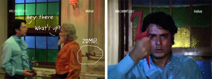Guruji reaches home where he stands there with the knife protruding out of him and has what seems like a casual conversation with an oblivious Gunawar. This cracks me up enormously.