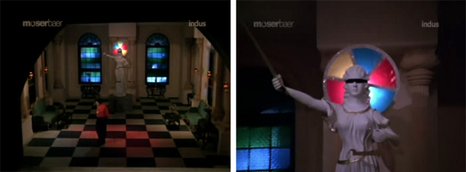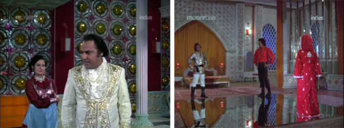Maharaja Bahadur Singh (Om Shivpuri) lives in a mirror-covered palace with his shrewish Maharani (Urmila Bhatt), his oldest son Gunawar (Master Romi) and infant son Vikram. He dotes on Gunawar, but the Maharani hates him as he is not her son; he is the result of an affair Bahadur had before marrying. She is insistent on her son Vikram being named the true heir. Gunawar is a large-hearted and generous boy, and his fencing guru (P Jairaj) takes him under his wing. Guruji is a man of strong principles, as evidenced by his ginormous statue of Lady Justice standing blindfolded in front of a large colored spinning wheel. (My grandmother had a wheel like that under her silver Christmas tree when I was a little girl, and I loved watching that tree change colors.)