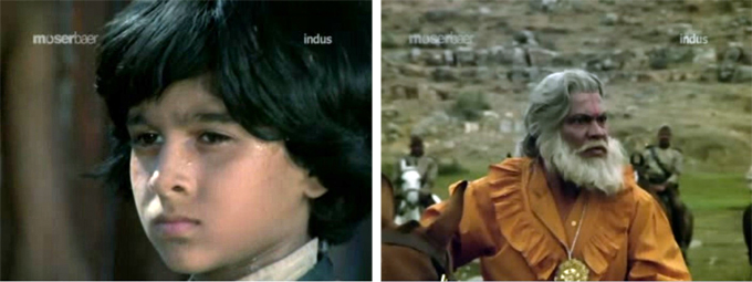 The CSP army is fairly easily defeated with the help of the little orphan boy and his slingshot. Sheru’s heart is melted by his sad little face. He adopts him on the spot as a brother and takes the boy home to his own Ma (Purnima). So sweet.