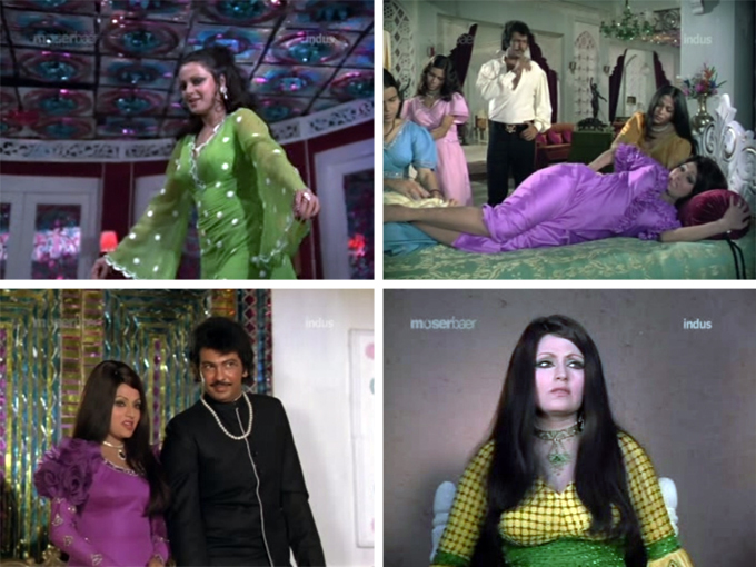 Oh those shiny outfits were so much the in thing in the films of those era – they have not totally vanished either! Alas internet and cable tv has whitewashed fashion all over the world and made it all homogenized. Those fluffy sleeves of Rekha in her second cap is priceless (some of my Mother’s dresses had them – but they never looked so funny as here – I think its the hairdo which sends it through the roof :D). And don’t knock silky shiny dresses…. next best thing to skin ;-). I much prefer this outfits (so creative!) than the photocopied outfits of these days.