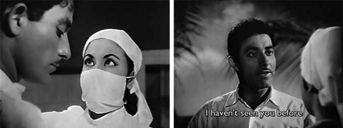 Performing the surgery with great skill is Dr. Sushil Verma (Raaj Kumar). The dramatic music and stern concentration of the operating staff emphasize that hospitals are serious business. I love the old-fashioned Harlequin Romance atmosphere of it all. And oh! the titillating mystery of masks and gowns: when Sushil and Karuna are relieved of theirs, the attraction between them is instant.