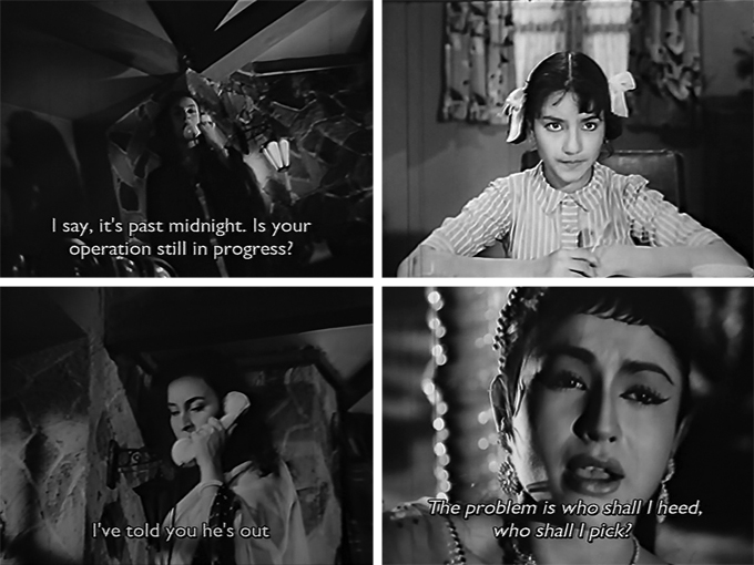 The first time I saw it in the hall, the camera work and lighting was one of the (many) reasons which made me fall in love with this movie. With Amrohi as the producer, the film was probably made under his eagle eye supervision. Meena Kumari always worked best in films associated with him (alas too too few). While I sensed the western touch to Nadira here (and loved it!) I didn’t see the parallel to Joan Crawford – and it is startling (the last two caps).
