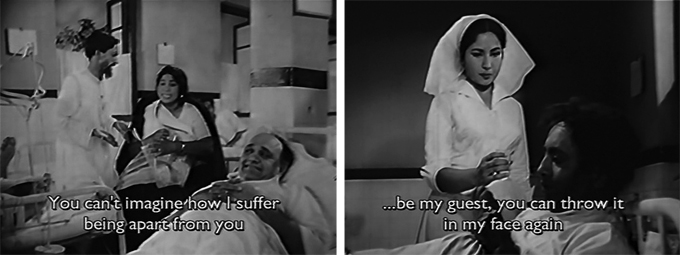 What surprised me was that Meena doesn’t look awkward in the nurse’s uniform. There is that long walk away from Raj Kumar as he holds the phone with his wife on the other side. Her walk is very elegant. The camera focuses on her back, in full view which I would have thought would be risiko, but wasn’t.
