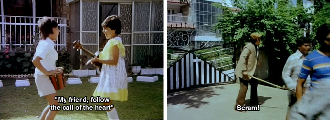 How did this…TING…pass muster even with Babbar Subhash and Bappi Lahiri? The only word I can think of to describe Sam’s dancing is excruciating, but that doesn’t even come close. Do you think there were any rehearsals? Or did the dance directors just give up? Maybe everybody hoped that we’d all be too blinded by the mirrors and spandex to notice.
