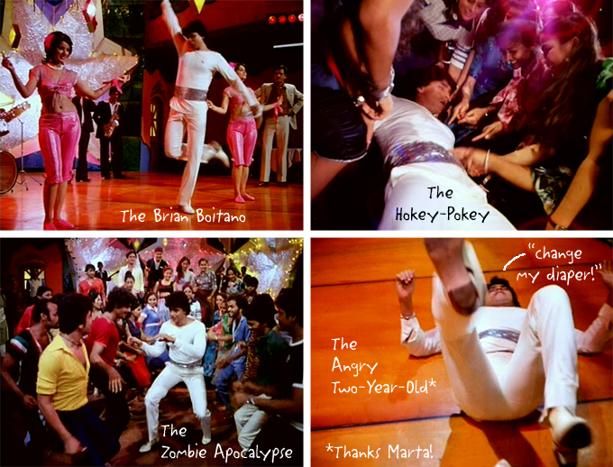 From a cinematic tradition overflowing with mama’s boys, by far the biggest to emerge is Disco Dancer‘s Jimmy. He only eats if Maa hand-feeds him, he dances like a girl, he sulks, he sucks his thumb, he lets women poke him in the belly, he is a failure at adult relationships with women (seriously, just ask Rita Oberoi, she’ll tell you), and he can’t go on when his mother dies while saving him from Death By Guitar. This film sends terrible messages to both women and men: you have no value, ladies, except as a downtrodden and self-sacrificing mother, and if you are lucky to have such a mama, men, you should never cut the apron strings. It is no coincidence that the bad people in it (the Oberois) have no mother figure in their household. Oh, and also: you should always carry a grudge. It will keep you going and help you succeed.