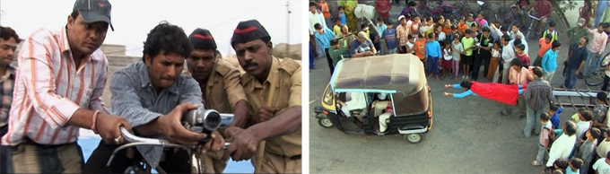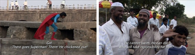 For all his hurdles, Nasir has a cast and crew who are willing to risk life and limb (and more!) for the project. His cameraman climbs a huge cell tower to find the appropriately dizzying height for a shot. His Superman, sweet-faced Shafique (who has since passed away, sadly and ironically, from oral cancer), is afraid of water and so thin that when he does get wet he shakes like a leaf, but he gives up his job for the duration of the shoot and submits himself to all kinds of situations.
