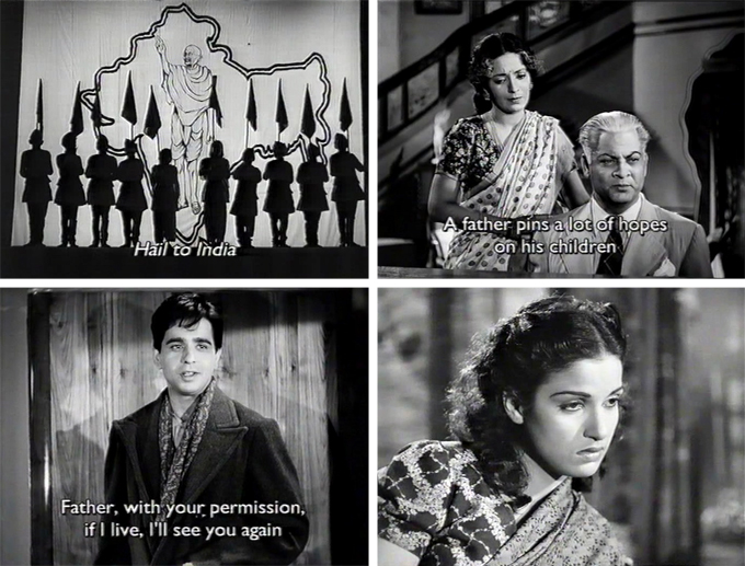 Most of you know by now that I am not terribly enamored of “earnest” movies that bludgeon the audience (i.e. me) repeatedly with trite patriotic messages. I feared this film would be like that but happily I was wrong. It is very enjoyable: part history lesson, part celebration of newly independent India, part debate whether violence is ever justified or not—still a relevant topic. Mostly, though, it’s a film about relationships, the most powerful one at hand being that between a young freedom fighter (Dilip Kumar) and his father (Chandramohan) with British loyalties. The title Shaheed (Martyr) can be applied to just about every character in the film, but the performances are, if sometimes a bit melodramatic, always heartfelt. I did get an excellent Chandramohan Nahiiin! Face but that can only be called a bonus. With eyes like that, how can he help it? The characters are well-drawn and complex, and there are touches of humor throughout to lighten what could otherwise be (okay, IS) a pretty depressing plot. And the chemistry between Dilip Kumar and Kamini Kaushal is very sweet, too.