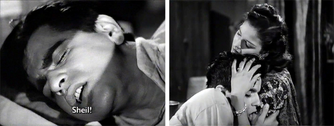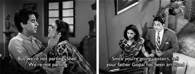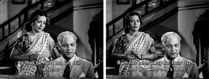 Each still unaware who the other person is, Sheila helps Ram escape from the now-moving train. He goes home, where his father hears him coming in at midnight. It’s clear that father and son barely communicate although they live in the same house, and it’s equally obvious that Dwarkadas both suspects and fears that Ram is participating in criminal rebel activity. This is a wonderful scene for Chandramohan, underplayed (especially for him) and touching in his anxiety for the son he can’t talk to. He tells his wife that there was a train robbery the night before and that the leader of the gang was wounded.