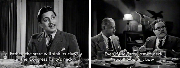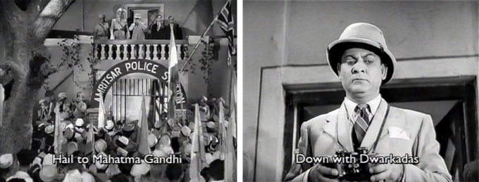 Playing Mahatma Gandhi, Gopal interrupts the taunting of the “British” and gives a speech about ahimsa (non-violence). Dwarkadas arrives at the party just as Vinod comes on stage to arrest “Gandhi” and is infuriated, stopping the play. He forbids Ram to see his “Sheil” again, although I’m glad to see he allows Ram his Nehru portrait, which mirrors that of Gandhi in the Rai household.