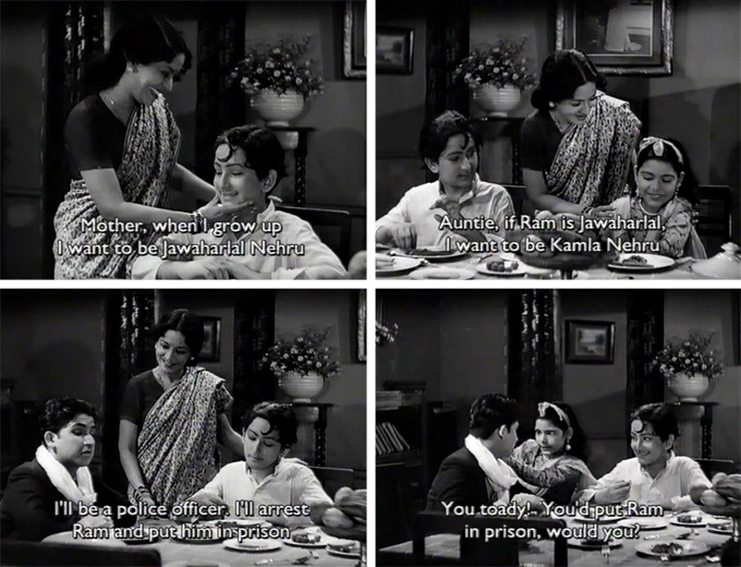 At home his loyalty to the British isolates him too. His wife (Leela Chitnis) and son Ram (Shashi Kapoor—but not that Shashi Kapoor) both admire the revolutionary spirit of Nehru and Gandhi, although Ram’s playmate Vinod—the son of Dwarkadas’ colleague and friend—is in agreement with Dwarkadas. Vinod and Ram are also rivals for young Sheila’s (Baby Anwari?) affections, although it’s pretty obvious that Ram is already the winner on this score.