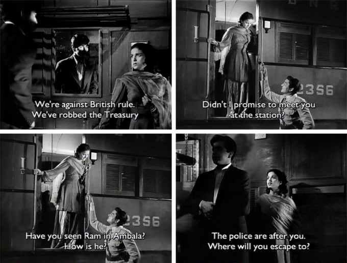 Dinner is interrupted by a phone call. Ram’s band of rebels has looted a train carrying state treasury, and Vinod dashes off to the scene. Wounded in the hand by police fire, Ram manages to escape into a train car occupied by a lone girl. It is Sheila (Kamini Kaushal) of course, but they fail to recognize each other. I am not sure if Sheila went off to school or what, but they have clearly not seen each other for years although Sheila has kept in touch with Vinod. When Vinod knocks on the door of her compartment, she doesn’t give away the wounded rebel hiding in her bathroom, although she clearly hurts Vinod’s feelings by asking about her beloved Ram.