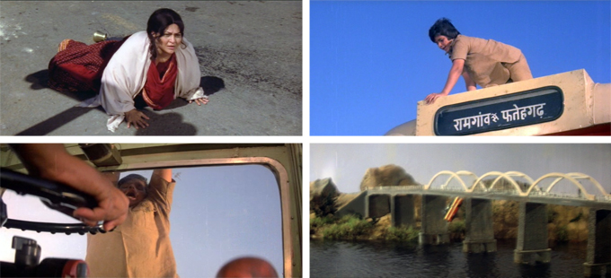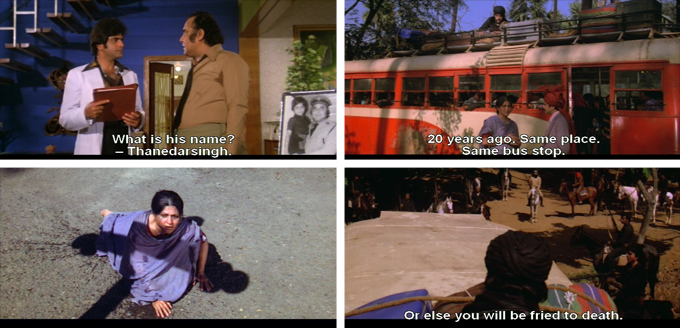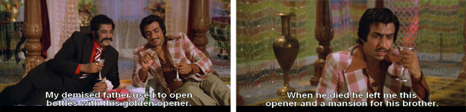 The wedding bus is stopped by Vikram Singh masquerading as Thanedar Singh, and Rakesh’s ears perk up. Real Thanedar Singh is fed up with this impersonation and Rakesh helps him fight off the bandits in a thrilling scene. During the melee, Thanedar Singh sees the gold bottle opener dangling from a masked Vijay’s wrist. When he reaches his hideout, he tells Champa what has happened and she—having seen it many time during Vijay’s trips to her kotha—tells Thanedar Singh who owns it.
