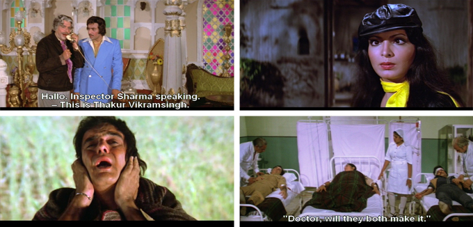 Watch Khoon Aur Paani to find out, and because it is so much fun. Rekha and Feroz Khan have nice chemistry together and though romance isn’t at all the focus of the movie, Parveen is pretty funny as Rita, the greedy go-getter. Jeetendra is also good as the upstanding Laxman/Rakesh and as I said earlier, Feroz is perhaps unwittingly very hysterical as troubled memory-less Thanedar Singh haunted by the sound of the local water-pump. Ajit has a great lair (complete with VW bus-sized elevator), he and Ranjeet are gleefully if somewhat incompetently evil, Laxmikant Pyarelal provide solid music, and it is a firmly tongue-in-cheek masala good time.