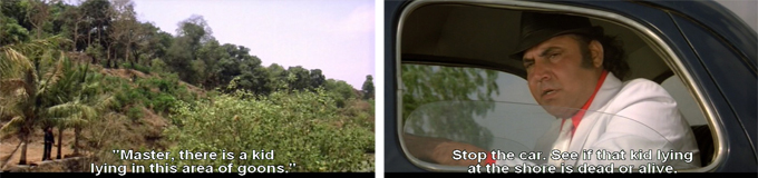 Ram washes ashore in an area frequented by dacoits (as the guy who finds him hilariously makes sure we know); Laxman is found by kind and lonely Police Commissioner Bhalla (Om Shivpuri).