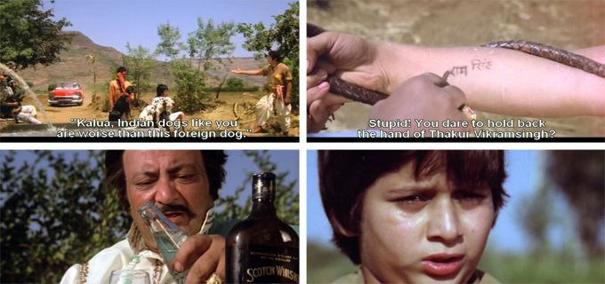 Farmer Singh steps in to defend his son from the Thakur’s men as the Thakur (Rajan Haksar) and his brother Vikram (Ajit) drive onto the scene. Vikram Singh gets out of the car and begins whipping Ram’s father; Ram stops him and Vikram stubs his cigar out on Ram’s arm (just beside the tattoo which he needs more than ever now that his locket has been sold). The Thakur impatiently throws a rifle to Vikram, and pours himself a scotch and water (salt in the proverbial wound!) as Vikram shoots the farmer dead. Ram can only stand and watch in horror (with one eye twitching) as his father’s blood stains the water red and the brothers Singh drive away.