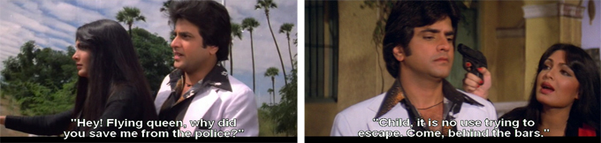 Meanwhile another very pretty lady by the name of Rita (Parveen Babi) is looking for a thief named Rocky who has a 10,000 Rs price on his head. Rocky is none other than Rakesh, aka Laxman, and he gambles too. On the run from the police, he is rescued by Rita on her motorcycle who whisks him away…and after stopping for a love song, takes him straight to the local lock-up. She is a bounty hunter, which is just awesome.