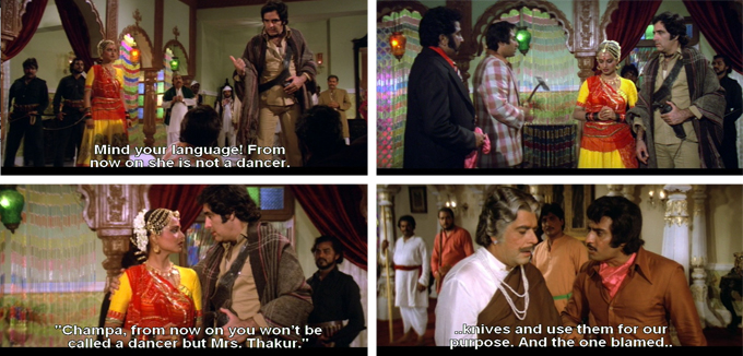 Thanedar Singh bursts in as Champa is singing and dancing for them, and skewers Vijay’s money with his signature dagger. He announces to the room at large that Champa belongs to him now (so romantic) and boots Vijay and Shakal out. Vijay takes his pile of money still embedded with Thanedar’s knife and a PLAN.
