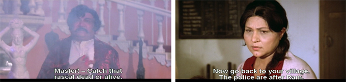 Dreaded (only by sinners, because he is a Robin Hood type of guy) dacoit Thanedar Singh (yes, everybody is named Singh in this movie) (Feroz Khan) has two weaknesses: he cannot remember anything about his childhood from before he was rescued by dacoits from a nearby river, and the sound of the local water-pump terrifies him to the point where he has to shut it off as soon as he hears it. We flash back to before he lost his memory, when he was young Ram (Master Bittoo), the son of a village farmer Singh (P Jairaj) and his wife (Nirupa Roy), with a younger brother called Laxman (Master Raju Shrestha).