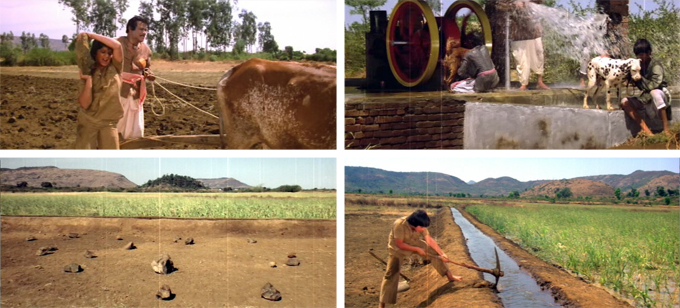 One day as Ram is helping his father clear rocks from their dry and barren land, hoping for rain, Ram notices the servants of the local zamindar bathing his “English” dog (a dalmation) in the abundant water running from his pump. He also notices the stark difference between his own family’s ancestral land, and that of the Thakur; using his pick, he begins to break the banks of the irrigation canal belonging to the Thakur.