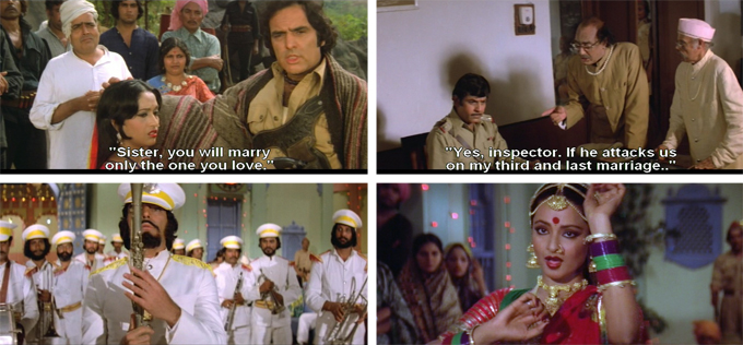 Despite the heavily armed police presence—Jankidas having alerted them—Thanedar Singh and his men prevent the wedding from going through, loot the bridegroom and burn his account books, get the erstwhile bride married to the poor farmer she loves, take all the guns belonging to the police; and Thanedar loses his heart to a tawaif named Champabai (Rekha).