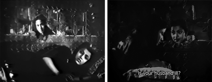 By now I feel like getting details of plot out of this film is like undergoing a root canal: painful and really really endless. Shravan continues to mope and watch Sheetal’s every move (which isn’t many, as she mostly lies in bed), and I realize that I don’t much care for him: he is gloomy, spineless and self-pitying. In point of fact nobody here is much fun, as Sheetal tends to her husband, wracked by coughing, between her own bouts of weeping and hopeless staring into space from her bed. A new character now enters the picture in the form of Gomti (Roopmala), a neighbor introduced in much the same supine way as everyone else, but who turns out to be a bit more lively thank goodness when she befriends Sheetal.