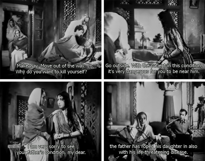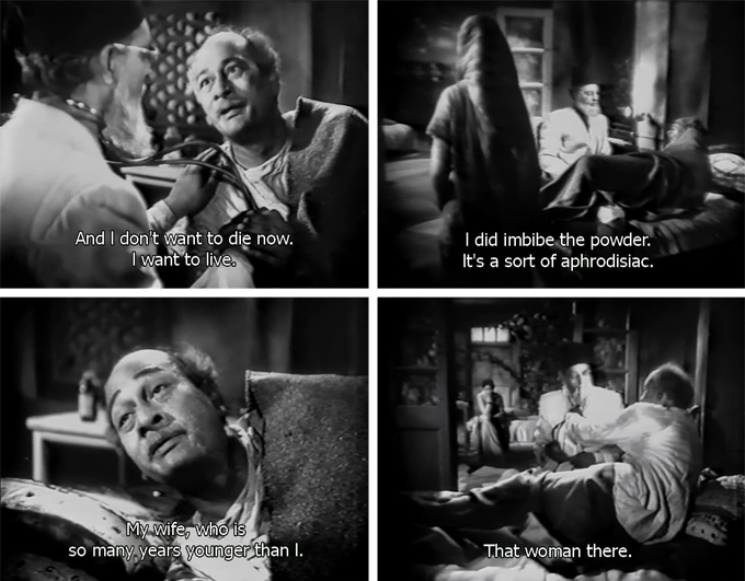 You can leave it the way you wish to interpret it. :Daera means boundary – it is possible that a young woman who is married to an older man is not happy due to the reason mentioned in the first two stills (the aphrodisiac bit, I mean). Despite being sexually repressed, the young woman cannot think of crossing the boundary (Daera) for fear of being ostacrised by society. That was the case in the 50’s in India. She cannot openly express her love for another man for the same reason and she throws away the letter disdainfully because there is no point. She doesn’t want to live even if her husband is recovering as her physical needs would still remain unfulfilled. And, she is young ! So, where does that leave her ? So, she prefers death. Also, please note the hero or his mother think she is his daughter. The film doesn’t dwelve on (presumably) what the hero feels once he realises that the lady whom he pines for is someone else’s wife. For his mother, it would have been blasphemy to get her son married to someone else’s wife !