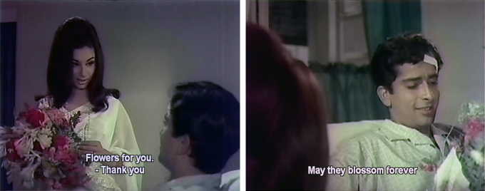You are not mistaken, actually Rajendranath “borrows” Shashi’s gown (when Shashi sees him in it he says “Mera gown!” which made me laugh. You can keep the sound on, it won’t distract from the Shashi drool opportunities :)