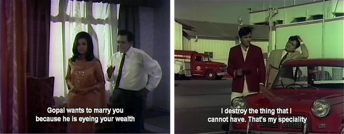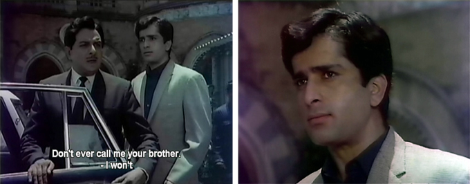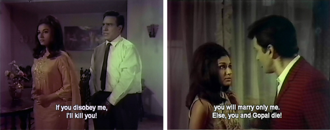 Sapna’s new romance does not go down at all well with Prem or Pran, who want her to marry Prem. Prem pressures Pran, who pressures Sapna, who is obstinate. If I had to choose between a guy who looks like Shashi and only wanted my money and a guy who talks through a clenched jaw and specializes in destroying things he can’t have, I’d choose Gopal too.