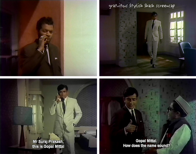 Now, we all know that because he is The Shash, he cannot possibly be guilty, right? The filmmakers know this too, and so bend over backwards to try and make us think this might be different. He gets off a plane, dressed in a natty white suit with drainpipe pants and sunglasses, watched by a suspicious-looking character smoking a cigar (Shinde—dear Edwina’s brother-in-law, husband of sister Marie and a dancer/musician in his own right). Deepak exits the airport looking nervously over his shoulder and on the way to his hotel switches from one taxi to another in an obvious effort to obscure his trail.