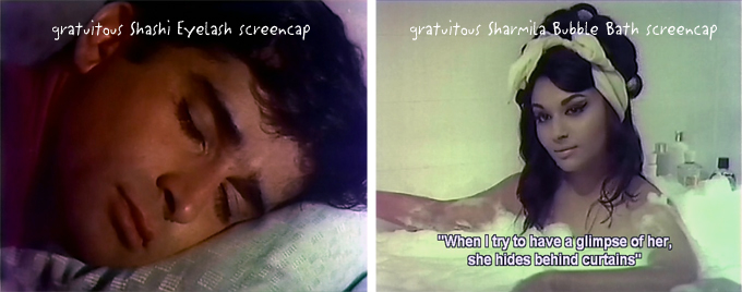 Did you do a quick costume change (while sitting with your lamp in the nightclub) and dance with Shashi? One of the gori women looks a lot like you! Plus wouldn’t it be a hoot to dance with Shashi while he is doing a Shammi number, with Sharmila looking bored?