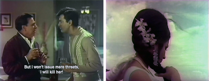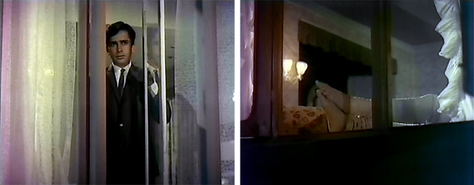 Sapna’s older brother Pran (Madan Puri) appears on the scene (in one of those “of course this is going to be someone benign because we’re so obviously supposed to be afraid” approaches), and when Sapna complains about her pesky new neighbor he assures her that he’ll take care of her. More Hitchcockian lurking and spying from the rear window ensues. I am distracted by those bunchy things behind Shashi’s head. What ARE they? Grapes for someone to peel?