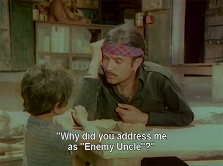 I was telling my friend Suhan the other night that I have stopped writing reviews mostly because I felt like I was endlessly repeating myself, and my threshold for lunacy had become so ridiculous that very little made me sit up and say “OOOOH!” any more. But lately I have been missing my daily masala dosage, so when this Feroz Khan-Vinod Khanna starrer appeared on my radar I couldn’t resist it. It is—not unexpectedly—a predictable and formulaic film, but it moves along at a fast clip thanks to relegating large portions of the action to narration by the characters (often to each other via telephone) after the fact (“Shankar and Shambhu have escaped from jail!” “We have kidnapped your daughter!”) instead of actually showing it to us, leaving details like “How?” “Why?” “Where?” and “When?” up to the viewer’s imagination. Screen time is largely devoted to Ornament with a capital “O”: a mish-mash of dacoit hideaways, corrupt rich people mansions dotted with crazy, and eye-popping disguises. This is okay with me.