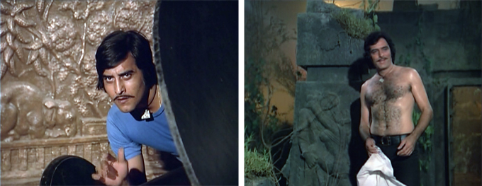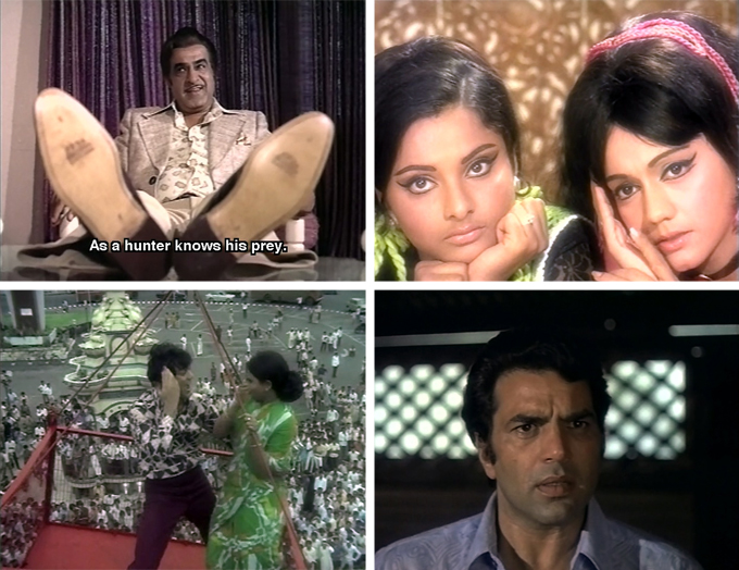 I was telling my friend Suhan the other night that I have stopped writing reviews mostly because I felt like I was endlessly repeating myself, and my threshold for lunacy had become so ridiculous that very little made me sit up and say “OOOOH!” any more. But lately I have been missing my daily masala dosage, so when this Feroz Khan-Vinod Khanna starrer appeared on my radar I couldn’t resist it. It is—not unexpectedly—a predictable and formulaic film, but it moves along at a fast clip thanks to relegating large portions of the action to narration by the characters (often to each other via telephone) after the fact (“Shankar and Shambhu have escaped from jail!” “We have kidnapped your daughter!”) instead of actually showing it to us, leaving details like “How?” “Why?” “Where?” and “When?” up to the viewer’s imagination. Screen time is largely devoted to Ornament with a capital “O”: a mish-mash of dacoit hideaways, corrupt rich people mansions dotted with crazy, and eye-popping disguises. This is okay with me.